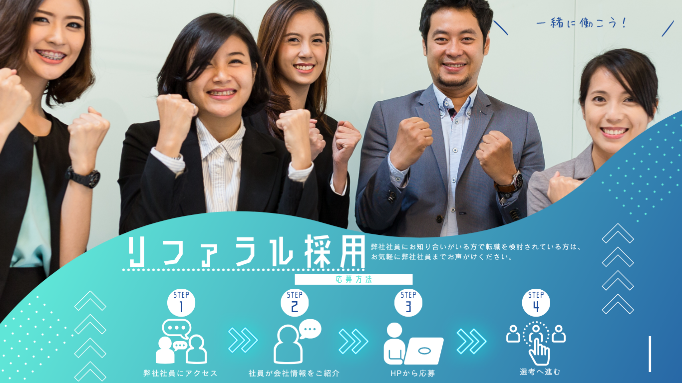 求める人物像 | 当社のモットーは、『将来的に社員を独立させる』ことです。 会社で決められた事だけを行う技術者ではなく、 自分で提案し、前向きに仕事に取り組むという環境作りを重視しています。 夢や目標を持って仕事にチャレンジしていただければ、自ずと成果が得られると思います。 |